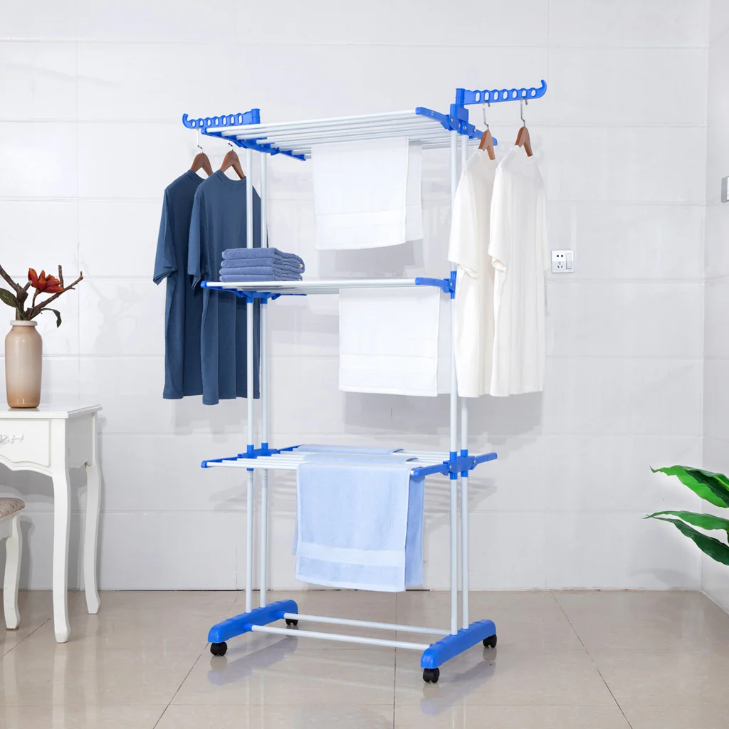 TP Wäscheständer 3 Ebenen klappbar, mobil ca. 18 Meter Wäscheleine, mit Seitenflügel blau
